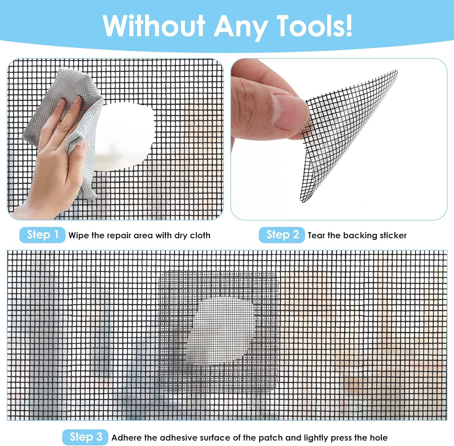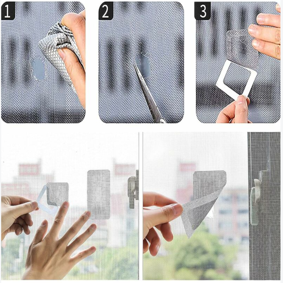 Largement utilisé : composé d'un autocollant de haute qualité et d'une grille en polyuréthane durable, résistant à l'usure, longue durée de vie. Adaptable pour les fenêtres à la maison ou au bureau. Parfait pour les cuisines, chambres, salons, vérandas, etc. Lors du camping en plein air, c'est un kit de réparation d'urgence parfait pour réparer les trous sur les tentes.